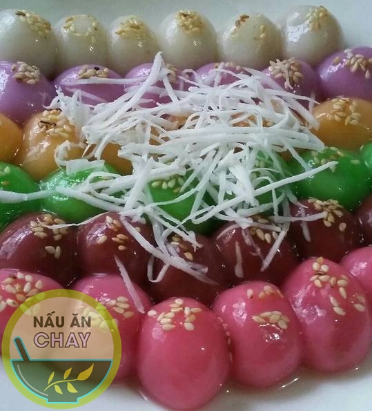 Bánh trôi: lấy đĩa vớt bánh trôi lên rắc vừng đã rang lên từng viên bánh